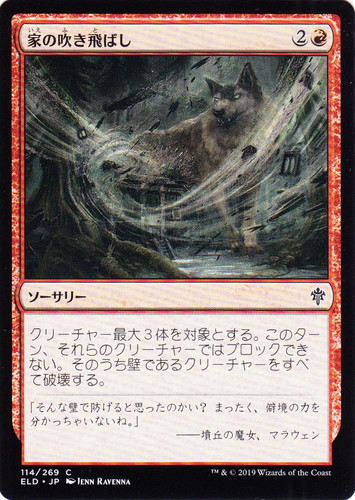 ![]() ![]() | ELD 114 家の吹き飛ばし ソーサリー エルドレインの王権 C 色:赤 マナコスト:(2)(赤) クリーチャー最大3体を対象とする。このターン、それらのクリーチャーではブロックできない。そのうち壁であるクリーチャーをすべて破壊する。 「そんな壁で防げると思ったのかい?まったく、僻境の力を分かっちゃいないね。」 ――墳丘の魔女、マラウェン illust:JENN RAVENNA |