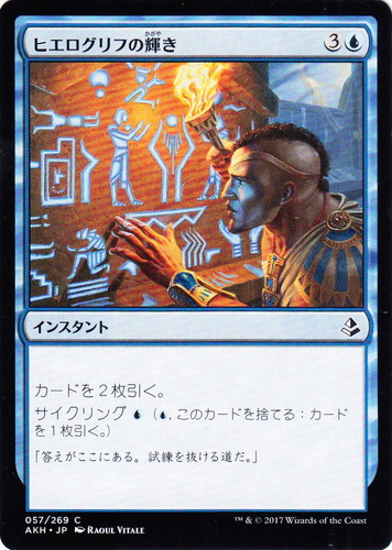 ![]() ![]() | AKH 057 ヒエログリフの輝き インスタント アモンケット C 色:青 マナコスト:(3)(青) カードを2枚引く。 サイクリング(青)((青), このカードを捨てる:カードを1枚引く。) 「答えがここにある。試練を抜ける道だ。」 illust:RAOUL VITALE |