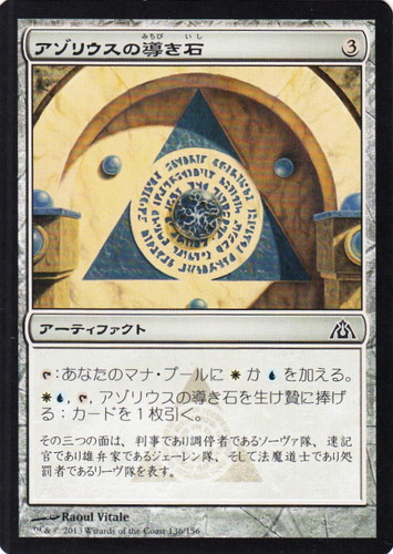 ![]() ![]() | DGM 136 アゾリウスの導き石 アーティファクト ドラゴンの迷路 C 色:無色 マナコスト:(3) 透かしシンボル:アゾリウス [T]:あなたのマナ・プールに(白)か(青)を加える。 (白)(青), [T], アゾリウスの導き石を生け贄に捧げる:カードを1枚引く。 その三つの面は、判事であり調停者であるソーヴァ隊、速記官であり雄弁家であるジェーレン隊、そして法魔道士であり処罰者であるリーヴ隊を表す。 illust:Raoul Vitale |