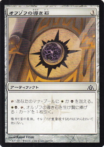![]() ![]() | DGM 142 オフゾフの導き石 アーティファクト ドラゴンの迷路 C 色:無色 マナコスト:(3) 透かしシンボル:オルゾフ [T]:あなたのマナ・プールに(白)か(黒)を加える。 (白)(黒), [T], オルゾフの導き石を生け贄に捧げる:カードを1枚引く。 権力と富の象徴。オルゾフが重要視するものはこれらをおいて他にない。 illust:Raoul Vitale |