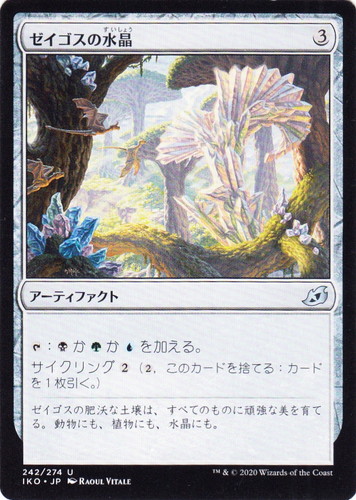 ![]() ![]() | IKO 242 ゼイゴスの水晶 アーティファクト イコリア:巨獣の棲処 U 色:無色 マナコスト:(3) [T]:(黒)か(緑)か(青)を加える。 サイクリング(2)((2), このカードを捨てる:カードを1枚引く。) ゼイゴスの肥沃な土壌は、すべてのものに頑強な美を育てる。動物にも、植物にも、水晶にも。 illust:RAOUL VITALE |