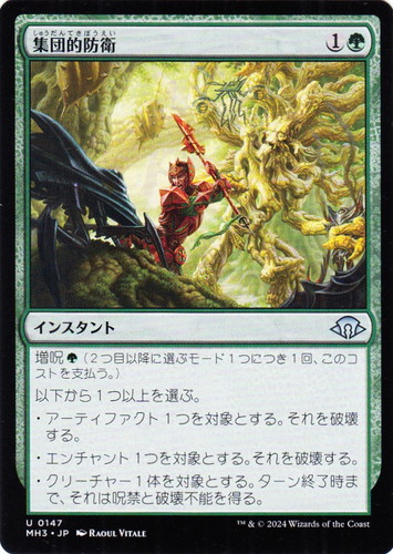 ![]() ![]() | MH3 0147 集団的防衛 インスタント モダンホライゾン3 U 色:緑 マナコスト:(1)(緑) 増呪(緑)(2つ目以降に選ぶモード1つにつき1回、このコストを支払う。) 以下から1つ以上を選ぶ。 ・アーティファクト1つを対象とする。それを破壊する。 ・エンチャント1つを対象とする。それを破壊する。 ・クリーチャー1体を対象とする。ターン終了時まで、それは呪禁と破壊不能を得る。 illust:RAOUL VITALE |