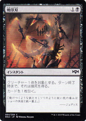 ![]() ![]() | RNA 064 焼印刃 インスタント ラヴニカの献身 C 色:黒 マナコスト:(1)(黒) クリーチャー1体を対象とする。ターン終了時まで、それは接死を得る。 カードを1枚引く。 「焼けつくような鉄とカミソリのように鋭い杭の痛みはショーの快楽と紙一重よ。」 ――ジュディス illust:WINONA NELSON |