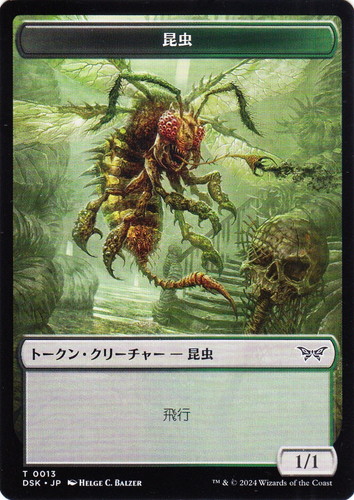 ![]() ![]() | DSK T0013 昆虫・トークン トークン・クリーチャー ダスクモーン:戦慄の館 T 色:黒/緑 サブタイプ:昆虫 パワー:1 タフネス:1 飛行 両面:予示・注釈 illust:HELGE C. BALZER |