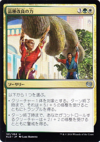 ![]() ![]() | KLD 181 品種改良の力 ソーサリー カラデシュ U 色:緑/白 マナコスト:(3)(緑)(白) 以下から1つを選ぶ。 ・クリーチャー1体を対象とする。ターン終了時まで、それは+5/+5の修整を受けるとともにトランプルを得る。 ・ターン終了時まで、あなたがコントロールするクリーチャーは+2/+2の修整を受けるとともに警戒を得る。 illust:LAKE HURWITZ |