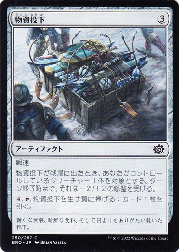 ![]() ![]() | BRO 250 物資投下 アーティファクト 兄弟戦争 C 色:無色 マナコスト:(3) 瞬速 物資投下が戦場に出たとき、あなたがコントロールしているクリーチャー1体を対象とする。ターン終了時まで、それは+2/+2の修整を受ける。 (4), [T], 物資投下を生け贄に捧げる:カード1枚を引く。 新たな武装、新鮮な食料、そして何よりもありがたい乾いた靴下。 illust:BRIAN VALEZA |