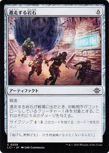 ![]() ![]() | LCI 0259 遁走する岩石 アーティファクト イクサラン:失われし洞窟 C 色:無色 マナコスト:(6) 瞬速 遁走する岩石が戦場に出たとき、対戦相手がコントロールしているクリーチャー1体を対象とする。これはそれに6点のダメージを与える。 サイクリング(2)((2), このカードを捨てる:カード1枚を引く。) 「逃げろ、野郎ども!ひき肉海賊になりたくないならな!」 illust:LOIC CANAVAGGIA |