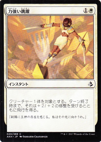 ![]() ![]() | AKH 020 力強い跳躍 インスタント アモンケット C 色:白 マナコスト:(1)(白) クリーチャー1体を対象とする。ターン終了時まで、それは+2/+2の修整を受けるとともに飛行を得る。 「副陽に王神の存在を感じる。私はその光に向かうわ。」 illust:SIDHARTH CHATURVEDI |