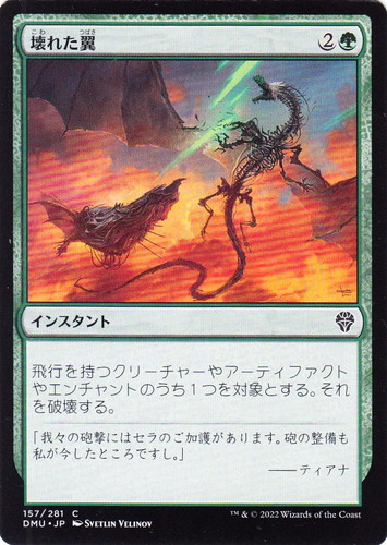 ![]() ![]() | DMU 157 壊れた翼 インスタント 団結のドミナリア C 色:緑 マナコスト:(2)(緑) 飛行を持つクリーチャーやアーティファクトやエンチャントのうち1つを対象とする。それを破壊する。 「我々の砲撃にはセラのご加護があります。砲の整備も私が今したところですし。」 ――ティアナ illust:SVETLIN VELINOV |