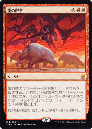 ![]() ![]() | DTK 133 龍の降下 ソーサリー タルキール龍紀伝 M 色:赤 マナコスト:(4)(赤)(赤) 望む数のクリーチャーを対象とし、それらを破壊する。これにより破壊されたクリーチャー1体につき、そのコントローラーは飛行を持つ赤の4/4のドラゴン・クリーチャー・トークンを1体戦場に出す。 龍は完全な形態で、恐ろしく飢えた状態で大嵐から出現する。 illust:STEVE PRESCOTT |