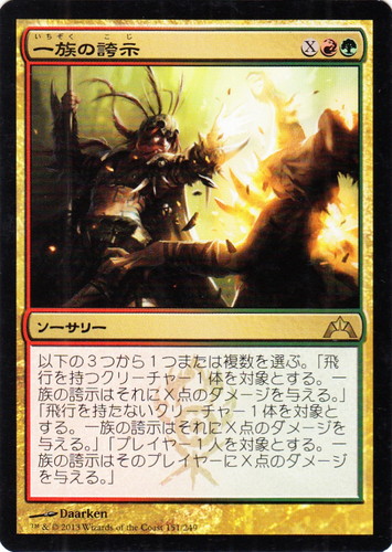 ![]() ![]() | GTC 151 一族の誇示 ソーサリー ギルド門侵犯 R 色:赤/緑 マナコスト:(X)(赤)(緑) 透かしシンボル:グルール 以下の3つから1つまたは複数を選ぶ。 「飛行を持つクリーチャー1体を対象とする。一族の誇示はそれにX点のダメージを与える。」 「飛行を持たないクリーチャー1体を対象とする。一族の誇示はそれにX点のダメージを与える。」 「プレイヤー1人に対象とする。一族の誇示はそのプレイヤーにX点のダメージを与える。」 illust:Daarken |