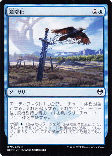 ![]() ![]() | KHM 072 鴉変化 ソーサリー カルドハイム C 色:青 マナコスト:(2)(青) 透かしシンボル:アールンド アーティファクト1つかクリーチャー1体を対象とする。それを追放する。それのコントローラーは、飛行を持つ青の1/1の鳥・クリーチャー・トークン1体を生成する。 予顕(青)(あなたのターンの間、あなたは(2)を支払って、あなたの手札からこのカードを裏向きに追放してもよい。後のターンに、これの予顕コストでこれを唱えてもよい。) illust:ANNA STEINBAUER |