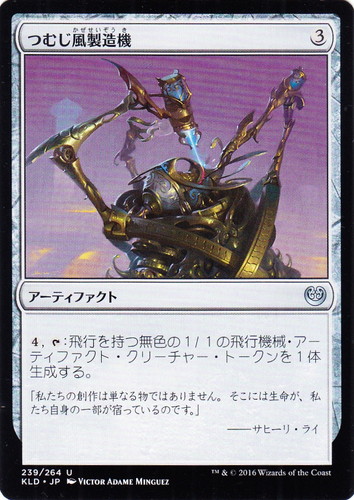 ![]() ![]() | KLD 239 つむじ風製造機 アーティファクト カラデシュ U 色:無色 マナコスト:(3) (4), [T]:飛行を持つ無色の1/1の飛行機械・アーティファクト・クリーチャー・トークンを1体生成する。 「私たちの創作は単なる物ではありません。そこには生命が、私たち自身の一部が宿っているのです。」 ――サヒーリ・ライ illust:VICTOR ADAME MINGUEZ |