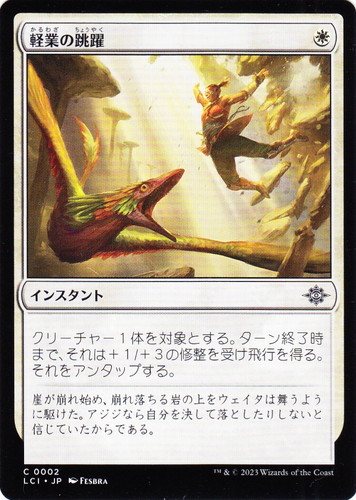 ![]() ![]() | LCI 0002 軽業の跳躍 インスタント イクサラン:失われし洞窟 C 色:白 マナコスト:(白) クリーチャー1体を対象とする。ターン終了時まで、それは+1/+3の修整を受け飛行を得る。それをアンタップする。 崖が崩れ始め、崩れ落ちる岩の上をウェイタは舞うように駆けた。アジジなら自分を決して落としたりしないと信じていたからである。 illust:FESBRA |