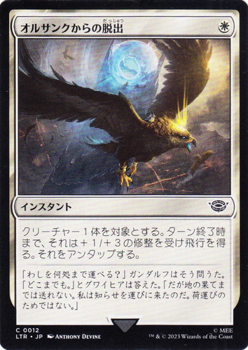 ![]() ![]() | LTR 0012 オルサンクからの脱出 インスタント 指輪物語:中つ国の伝承 C 色:白 マナコスト:(白) クリーチャー1体を対象とする。ターン終了時まで、それは+1/+3の修整を受け飛行を得る。それをアンタップする。 「わしを何処まで運べる?」ガンダルフはそう問うた。 「どこまでも。」とグワイヒアは答えた。「だが地の果てまでは送れない。私は知らせを運びに来たのだ。荷運びのためではない。」 illust:ANTHONY DEVINE 出典:指輪物語 |