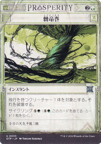 ![]() ![]() | OTP 0033 棘竜巻 インスタント サンダー・ジャンクションの無法者:速報 U 色:緑 マナコスト:(2)(緑) 飛行を持つクリーチャー1体を対象とする。それを破壊する。 サイクリング(1)(緑)((1)(緑), このカードを捨てる:カード1枚を引く。) 今日の天気予報:棘 illust:YOHANN SCHEPACZ |