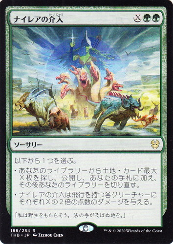 ![]() ![]() | THB 188 ナイレアの介入 ソーサリー テーロス還魂記 R 色:緑 マナコスト:(X)(緑)(緑) 以下から1つを選ぶ。 ・あなたのライブラリーから土地・カード最大X枚を探し、公開し、あなたの手札に加え、その後あなたのライブラリーを切り直す。 ・ナイレアの介入は飛行を持つ各クリーチャーにそれぞれXの2倍の点数のダメージを与える。 「私は野生をもたらそう。法の手が及ばぬ地を。」 illust:ZEZHOU CHEN |