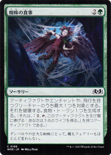 ![]() ![]() | WOE 0186 蜘蛛の食事 ソーサリー エルドレインの森 C 色:緑 マナコスト:(2)(緑) アーティファクトやエンチャントや、飛行を持つクリーチャーのうち最大1つを対象とする。それを破壊する。食物・トークン1つを生成する。(それは、「(2), [T], このアーティファクトを生け贄に捧げる:あなたは3点のライフを得る。」を持つアーティファクトである。) ダンバロウの巨大な蜘蛛にとって、蠅もフェアリーもほとんど変わらない。 illust:MILA PESIC |