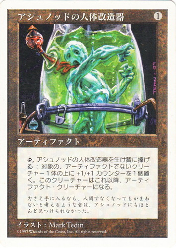 ![]() ![]() | アシュノッドの人体改造器 アーティファクト 基本セット 第5版 色:無色 マナコスト:(1) [T], アシュノッドの人体改造器を生け贄に捧げる:対象の、アーティファクトでないクリーチャー1体の上に+1/+1カウンターを1個置く。このクリーチャーはこれ以降、アーティファクト・クリーチャーになる。 力さえ手に入るようなら、人間でなくなってもかまわないと考えるような者は、アシュノッドにもほとんど見つけられなかった。 illust:Mark Tedin |