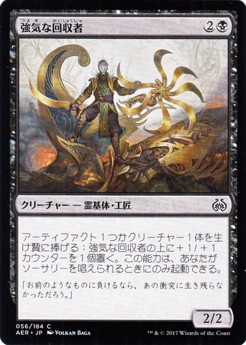 ![]() ![]() | AER 056 強気な回収者 クリーチャー 霊気紛争 C 色:黒 サブタイプ:霊基体・工匠 マナコスト:(2)(黒) パワー:2 タフネス:2 アーティファクト1つかクリーチャー1体を生け贄に捧げる:強気な回収者の上に+1/+1カウンターを1個置く。この能力は、あなたがソーサリーを唱えられるときにのみ起動できる。 「お前のようなものに負けるなら、あの衝突に生き残らなかっただろう。」 illust:VOLKAN BAGA |