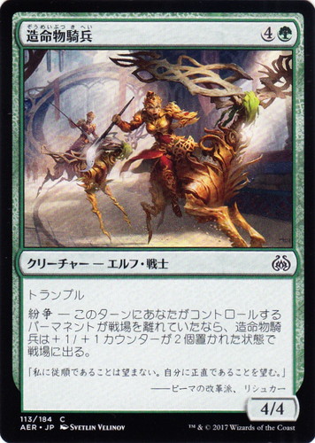 ![]() ![]() | AER 113 造命物騎兵 クリーチャー 霊気紛争 C 色:緑 サブタイプ:エルフ・戦士 マナコスト:(4)(緑) パワー:4 タフネス:4 トランプル 紛争―このターンにあなたがコントロールするパーマネントが戦場を離れていたなら、造命物騎兵は+1/+1カウンターが2個置かれた状態で戦場に出る。 「私に従順であることは望まない。自分に正直であることを望む。」 ――ピーマの改革派、リシュカー illust:SVETLIN VELINOV |