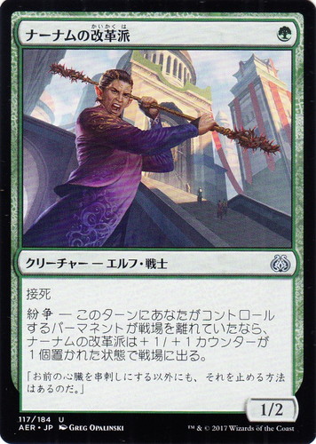 ![]() ![]() | AER 117 ナーナムの改革派 クリーチャー 霊気紛争 U 色:緑 サブタイプ:エルフ・戦士 マナコスト:(緑) パワー:1 タフネス:2 接死 紛争―このターンにあなたがコントロールするパーマネントが戦場を離れていたなら、ナーナムの改革派は+1/+1カウンターが1個置かれた状態で戦場に出る。 「お前の心臓を串刺しにする以外にも、それを止める方法はあるのだ。」 illust:GREG OPALINSKI |