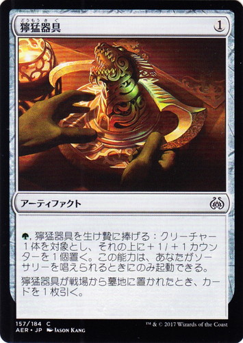 ![]() ![]() | AER 157 獰猛器具 アーティファクト 霊気紛争 C 色:無色 マナコスト:(1) (緑), 獰猛器具を生け贄に捧げる:クリーチャー1体を対象とし、それの上に+1/+1カウンターを1個置く。この能力は、あなたがソーサリーを唱えられるときにのみ起動できる。 獰猛器具が戦場から墓地に置かれたとき、カードを1枚引く。 illust:JASON KANG |