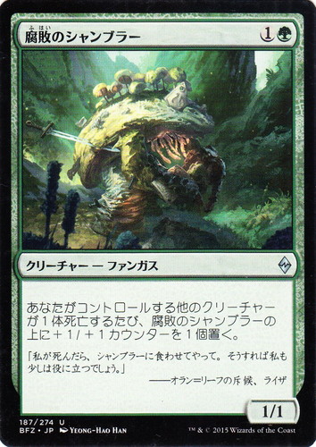 ![]() ![]() | BFZ 187 腐敗のシャンブラー クリーチャー 戦乱のゼンディカー U 色:緑 サブタイプ:ファンガス マナコスト:(1)(緑) パワー:1 タフネス:1 あなたがコントロールする他のクリーチャーが1体死亡するたび、腐敗のシャンブラーの上に+1/+1カウンターを1個置く。 「私が死んだら、シャンブラーに食わせてやって。そうすれば私も少しは役に立つでしょう。」 ――オラン=リーフの斥候、ライザ illust:YEONG-HAO HAN |