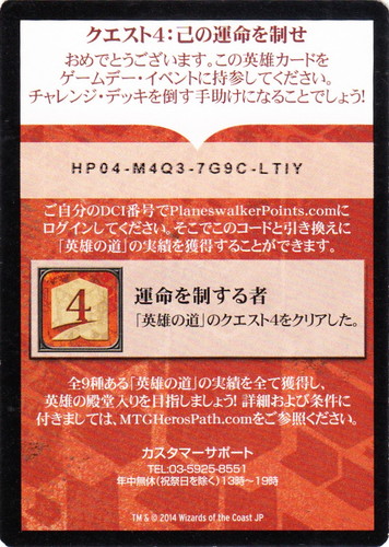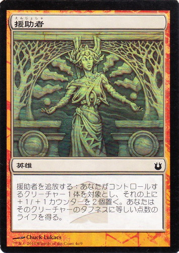 ![]() ![]() | BNG 4e 援助者 英雄 神々の軍勢(英雄カード) C 援助者を追放する:あなたがコントロールするクリーチャー1体を対象とし、それの上に+1/+1カウンターを2個置く。あなたはそのクリーチャーのタフネスに等しい点数のライフを得る。 クエスト4:己の運命を制せ おめでとうございます。この英雄カードをゲームデー・イベントに持参してください。チャレンジ・デッキを倒す手助けになるでしょう! ご自分のDCI番号でPlaneswalkerPoints.comにログインしてください。そこでこのコードと引き換えに「英雄の道」の実績を獲得することができます。 【4】運命を制する者 「英雄の道」のクエスト4をクリアした。 全9種ある「英雄の道」の実績を全て獲得し、英雄の電動入りを目指しましょう!詳細および条件に付きましては、MTGHeroPath.comをご参照ください。 カスタマーサポート TEL:03-5925-8551 年中無休(祝祭日を除く)13時~19時 illust:Chuck Lucacs |