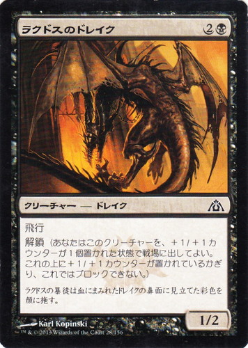 ![]() ![]() | DGM 028 ラクドスのドレイク クリーチャー ドラゴンの迷路 C 色:黒 サブタイプ:ドレイク マナコスト:(2)(黒) パワー:1 タフネス:2 透かしシンボル:ラクドス 飛行 解鎖(あなたはこのクリーチャーを、+1/+1カウンターが1個置かれた状態で戦場に出してもよい。これの上に+1/+1カウンターが置かれているかぎり、これではブロックできない。) ラクドスの暴徒は血にまみれたドレイクの鼻面に見立てた彩色を顔に施す。 illust:Karl Kopinski |
