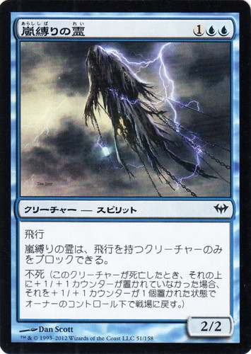 ![]() ![]() | DKA 051 嵐縛りの霊 クリーチャー 闇の隆盛 C 色:青 サブタイプ:スピリット マナコスト:(1)(青)(青) パワー:2 タフネス:2 飛行 嵐縛りの霊は、飛行を持つクリーチャーのみをブロックできる。 不死(このクリーチャーが死亡したとき、それの上に+1/+1カウンターが置かれていなかった場合、それを+1/+1カウンターが1個置かれた状態でオーナーのコントロール下で戦場に戻す。 illust:Dan Scott |