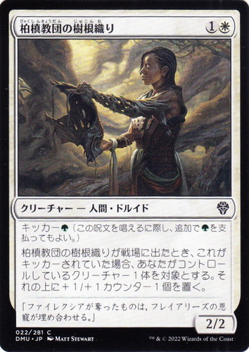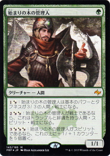 ![]() ![]() | FRF 143 始まりの木の管理人 クリーチャー 運命再編 M 色:緑 サブタイプ:人間 マナコスト:(緑) パワー:1 タフネス:1 透かしシンボル:アブザン (1)(白/黒):始まりの木の管理人は基本のパワーとタフネスが3/3の人間・戦士になる。 (2)(白/黒)(白/黒):始まりの木の管理人が戦士であるなら、これはトランプルと絆魂を持つ人間・スピリット・戦士になる。 (3)(白/黒)(白/黒)(白/黒):始まりの木の管理人がスピリットであるなら、これの上に+1/+1カウンターを5個置く。 illust:RYAN ALEXANDER LEE |