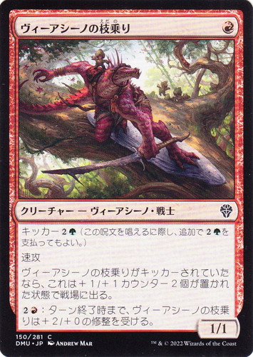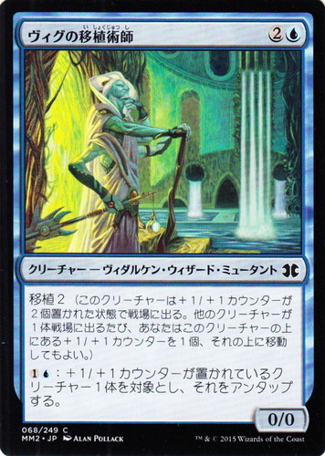![]() ![]() | MM2 068 ヴィグの移植術師 クリーチャー モダンマスターズ2015 C 色:青 サブタイプ:ヴィダルケン・ウィザード・ミュータント マナコスト:(2)(青) パワー:0 タフネス:0 移植2(このクリーチャーは+1/+1カウンターが2個置かれた状態で戦場に出る。他のクリーチャーが1体戦場に出るたび、あなたはこのクリーチャーの上にある+1/+1カウンターを1個、それの上に移動してもよい。) (1)(青):+1/+1カウンターが置かれているクリーチャー1体が対象とし、それをアンタップする。 illust:ALAN POLLACK |