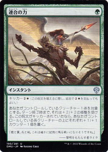 ![]() ![]() | DOM 155 高木の武装 インスタント ドミナリア C 色:緑 マナコスト:(緑) クリーチャー1体を対象とし、それの上に+1/+1カウンターを1個置く。ターン終了時まで、そのクリーチャーは到達を得る。 「ラノワールの大樹は待っていた。鉄葉の秋を解き放つときを。」 ――「フレイアリーズの歌」 illust:BAYARD WU |