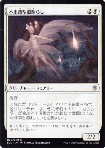 ![]() ![]() | ELD 022 不思議な道照らし クリーチャー エルドレインの王権 U 色:白 サブタイプ:フェアリー マナコスト:(2)(白) パワー:2 タフネス:2 飛行 あなたがコントロールしていて出来事を持つ各クリーチャーは、それぞれ+1/+1カウンターが追加で1個置かれた状態で戦場に出る。(出来事を経験している必要はない。) 良くも悪くも、大抵のフェイは騎士の遭遇する出来事に干渉せざるを得ない。 illust:KIMONAS THEODOSSIOU |