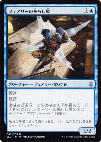 ![]() ![]() | ELD 045 フェアリーの荒らし屋 クリーチャー エルドレインの王権 U 色:青 サブタイプ:フェアリー・ならず者 マナコスト:(1)(青) パワー:1 タフネス:2 瞬速 飛行 あなたが各ターンのあなたの2枚目のカードを引くたび、フェアリーの荒らし屋の上に+1/+1カウンターを1個置く。 歴史は勝者によって綴られるというが、厄介な者に書き換えられることも多い。 illust:PAUL SCOTT CANAVAN |