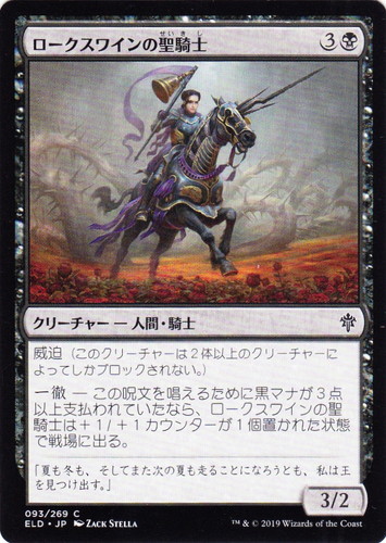 ![]() ![]() | ELD 093 ロークスワインの聖騎士 クリーチャー エルドレインの王権 C 色:黒 サブタイプ:人間・騎士 マナコスト:(3)(黒) パワー:3 タフネス:2 威迫(このクリーチャーは2体以上のクリーチャーによってしかブロックされない。) 一徹―この呪文を唱えるために黒マナが3点以上支払われていたなら、ロークスワインの聖騎士は+1/+1カウンターが1個置かれた状態で戦場に出る。 「夏も冬も、そしてまた次の夏も走ることになろうとも、私は王を見つけ出す。」 illust:ZACK STELLA |