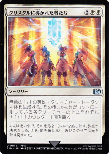 ![]() ![]() | FIN 0014 クリスタルに導かれた者たち ソーサリー FINAL FANTASY U 色:白 マナコスト:(5)(白)(白) 無色の1/1の英雄・クリーチャー・トークン4体を生成する。その後、あなたがコントロールしている各クリーチャーの上にそれぞれ+1/+1カウンター1個を置く。 4人は光の中で、その意思を、その心を感じ取り、旅立つ決意をした。さあ、闇を振り払い、再びこの世界に光を取り戻すのだ。 illust:木志田コテツ/KOTETSU KINOSHITA 出典:FFIII |