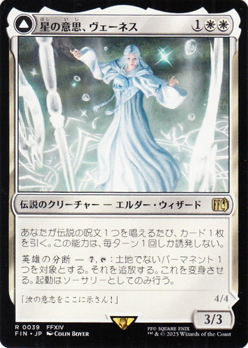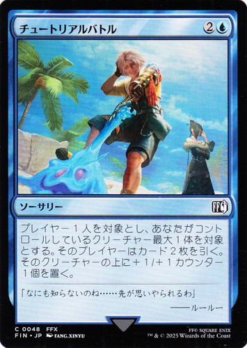 ![]() ![]() | FIN 0048 チュートリアルバトル ソーサリー FINAL FANTASY C 色:青 マナコスト:(2)(青) プレイヤー1人を対象とし、あなたがコントロールしているクリーチャー最大1体を対象とする。そのプレイヤーはカード2枚を引く。そのクリーチャーの上に+1/+1カウンター1個を置く。 「なにも知らないのね・・・・・・先が思いやられるわ」 ――ルールー illust:FANG. XINYU 出典:FFX |