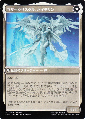 ![]() ![]() | FIN 0039 マザークリスタル、ハイデリン 伝説のクリーチャー FINAL FANTASY R 色:白 サブタイプ:神 パワー:4 タフネス:4 破壊不能 光の加護―あなたのターンの戦闘の開始時に、あなたがコントロールしていてこれでないクリーチャー1体を対象とする。それの上に+1/+1カウンター1個を置く。次のあなたのターンまで、それは破壊不能を得る。そのクリーチャーが伝説であるなら、カード1枚を引く。 両面:星の意思、ヴェーネス 「闇に屈せぬ光の意志を持つ者よ。どうか星を滅びより救うためにあなたの力を・・・・・・。」 illust:COLIN BOYER 出典:FFXIV |