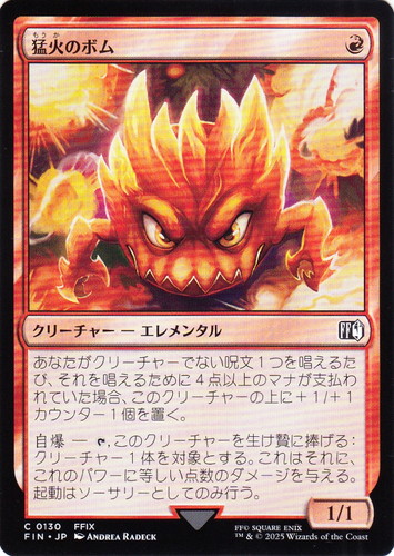 ![]() ![]() | FIN 0130 猛火のボム クリーチャー FINAL FANTASY C 色:赤 サブタイプ:エレメンタル マナコスト:(赤) パワー:1 タフネス:1 あなたがクリーチャーでない呪文1つを唱えるたび、それを唱えるために4点以上のマナが支払われていた場合、このクリーチャーの上に+1/+1カウンター1個を置く。 自爆―[T], このクリーチャーを生け贄に捧げる:クリーチャー1体を対象とする。これはそれに、これのパワーに等しい点数のダメージを与える。起動はソーサリーとしてのみ行う。 illust:ANDREA RADECK 出典:FFIX |