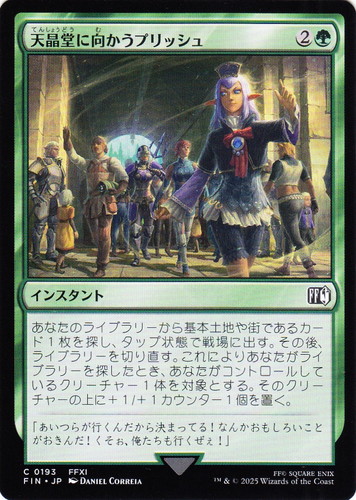 ![]() ![]() | FIN 0193 天晶堂に向かうプリッシュ インスタント FINAL FANTASY C 色:緑 マナコスト:(2)(緑) あなたのライブラリーから基本土地や街であるカード1枚を探し、タップ状態で戦場に出す。その後、ライブラリーを切り直す。これによりあなたがライブラリーを探したとき、あなたがコントロールしているクリーチャー1体を対象とする。そのクリーチャーの上に+1/+1カウンター1個を置く。 「あいつらが行くんだから決まってる!なんかおもしろいことがおきんだ!くそぉ、俺たちも行くぜぇ!」 illust:DANIEL CORREIA 出典:FFXI |