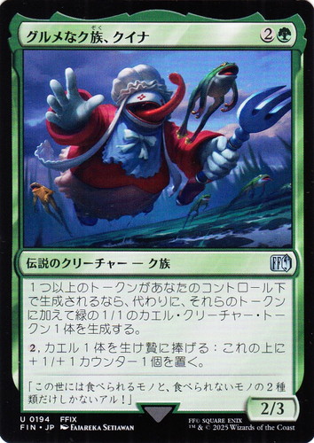 ![]() ![]() | FIN 0194 グルメなク族、クイナ 伝説のクリーチャー FINAL FANTASY U 色:緑 サブタイプ:ク族 マナコスト:(2)(緑) パワー:2 タフネス:3 1つ以上のトークンがあなたのコントロール下で生成されるなら、代わりに、それらのトークンに加えて緑の1/1のカエル・クリーチャー・トークン1体を生成する。 (2), カエル1体を生け贄に捧げる:これの上に+1/+1カウンター1個を置く。 「この世には食べられるモノと、食べられないモノの2種類だけしかないアル!」 illust:FAJAREKA SETIAWAN 出典:FFIX |