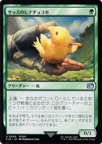 ![]() ![]() | FIN 0200 サッズのヒナチョコボ クリーチャー FINAL FANTASY U 色:緑 サブタイプ:鳥 マナコスト:(緑) パワー:0 タフネス:1 上陸―あなたがコントロールしている土地1つが戦場に出るたび、このクリーチャーの上に+1/+1カウンター1個を置く。 本名は不明で、その正体にはコクーンの存亡に関わる秘密が隠されて・・・・・・いるわけもなく、単にサッズがまだ名前を決めていないだけである。 illust:DOMENICO CAVA 出典:FFXIII |