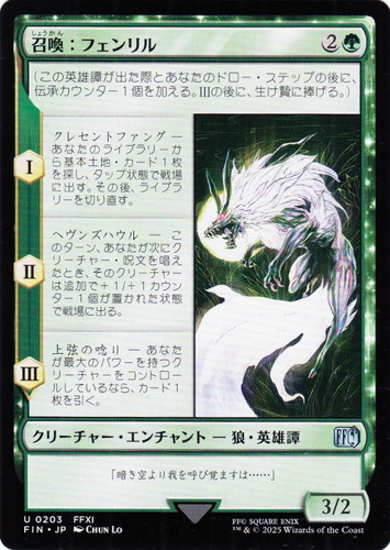 ![]() ![]() | FIN 0203 召喚:フェンリル クリーチャー・エンチャント FINAL FANTASY U 色:緑 サブタイプ:狼・英雄譚 マナコスト:(2)(緑) パワー:3 タフネス:2 (この英雄譚が出た際とあなたのドロー・ステップの後に、[[text:伝承カウンター1個を加える。IIIの後に、生け贄に捧げる。) [I]クレセントファング―あなたのライブラリーから基本土地・カード1枚を探し、タップ状態で戦場に出す。その後、ライブラリーを切り直す。 [II]ヘヴンズハウル―このターン、あなたが次にクリーチャー・呪文を唱えたとき、そのクリーチャーは追加で+1/+1カウンター1個が置かれた状態で戦場に出る。 [III]上弦の唸り―あなたが最大のパワーを持つクリーチャーをコントロールしているなら、カード1枚を引く。 「暗き空より我を呼び覚ますは・・・・・・」 illust:CHUN LO 出典:FFXI |