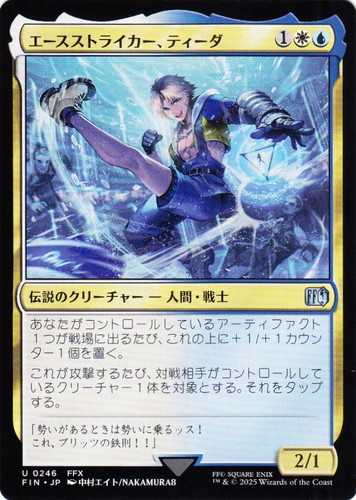 ![]() ![]() | FIN 0246 エースストライカー、ティーダ 伝説のクリーチャー FINAL FANTASY U 色:白/青 サブタイプ:人間・戦士 マナコスト:(1)(白)(青) パワー:2 タフネス:1 あなたがコントロールしているアーティファクト1つが戦場に出るたび、これの上に+1/+1カウンター1個を置く。 これが攻撃するたび、対戦相手がコントロールしているクリーチャー1体を対象とする。それをタップする。 「勢いがあるときは勢いに乗るッス! これ、ブリッツの鉄則!!」 illust:中村エイト/NAKAMURA8 出典:FFX |