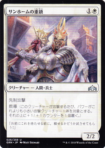 ![]() ![]() | GRN 026 サンホームの重鎮 クリーチャー ラヴニカのギルド U 色:白 サブタイプ:人間・兵士 マナコスト:(1)(白) パワー:2 タフネス:2 透かしシンボル:ボロス 先制攻撃 教導(このクリーチャーが攻撃するたび、パワーがこれよりも小さい攻撃クリーチャー1体を対象とする。それの上に+1/+1カウンターを1個置く。) 「お前にこれを持たせる前に、躱せるかどうか試させてもらう!」 illust:MATT STEWART |