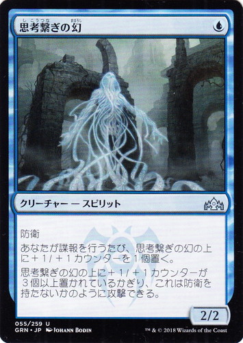 ![]() ![]() | GRN 055 思考繋ぎの幻 クリーチャー ラヴニカのギルド U 色:青 サブタイプ:スピリット マナコスト:(青) パワー:2 タフネス:2 透かしシンボル:ディミーア 防衛 あなたが諜報を行うたび、思考繋ぎの幻の上に+1/+1カウンターを1個置く。 思考繋ぎの幻の上に+1/+1カウンターが置かれているかぎり、これは防衛を持たないかのように攻撃できる。 illust:JOHANN BODIN |
