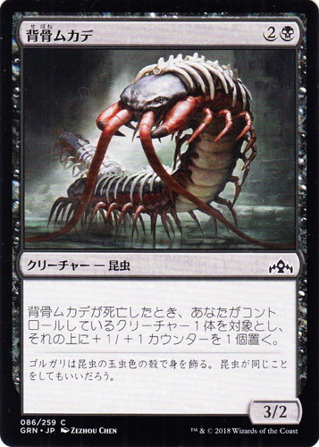 ![]() ![]() | GRN 086 背骨ムカデ クリーチャー ラヴニカのギルド C 色:黒 サブタイプ:昆虫 マナコスト:(2)(黒) パワー:3 タフネス:2 背骨ムカデが死亡したとき、あなたがコントロールしているクリーチャー1体を対象とし、それの上に+1/+1カウンターを1個置く。 ゴルガリは昆虫の玉虫色の殻で身を飾る。昆虫が同じことをしてもいいだろう。 illust:ZEZHOU CHEN |