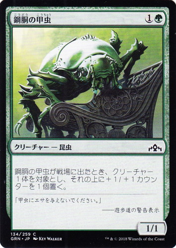 ![]() ![]() | GRN 134 鋼胴の甲虫 クリーチャー ラヴニカのギルド C 色:緑 サブタイプ:昆虫 マナコスト:(1)(緑) パワー:1 タフネス:1 鋼胴の甲虫が戦場に出たとき、クリーチャー1体を対象とし、それの上に+1/+1カウンターを1個置く。 「甲虫にエサを与えないでください。」 ――遊歩道の警告表示 illust:KEV WALKER |